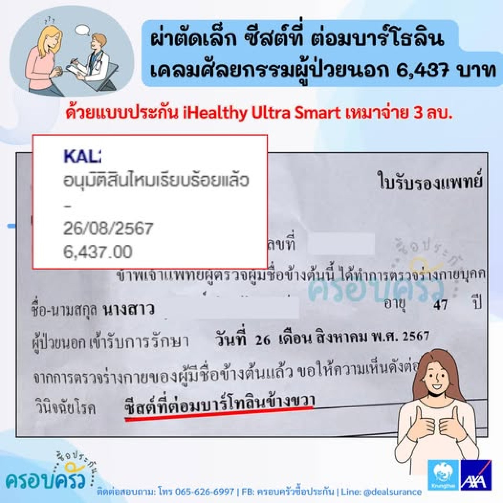 เคสน้องผู้หญิง #ผ่าซีสต์ต่อมบาร์โธลิน เคลม 6,437 บาท ด้วยวงเงินเหมาจ่ายสูงสุด ในแบบ #ประกันสุขภาพเหมาจ่าย #iHealthy จาก #กรุงไทยแอกซ่า