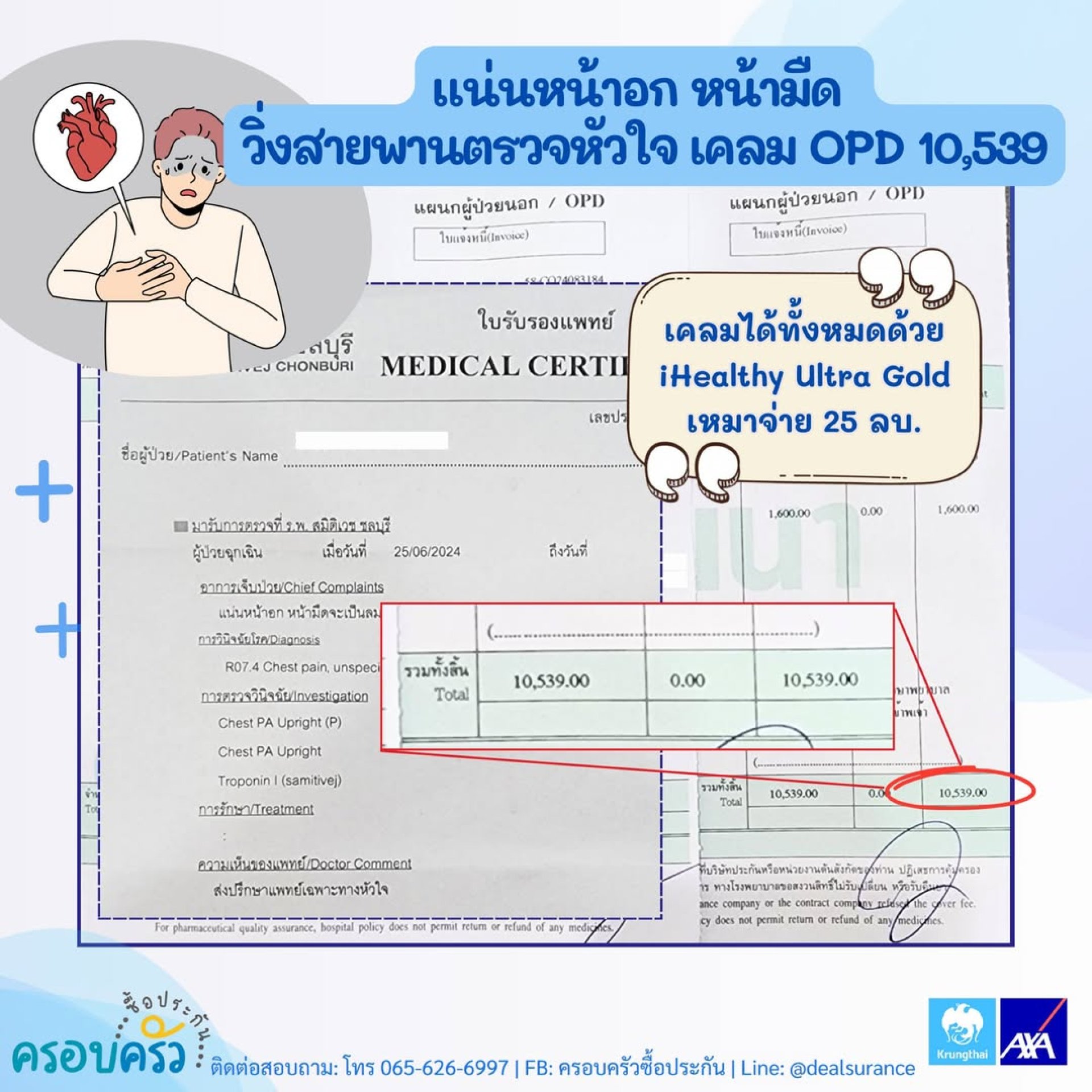 ตื่นเช้ามา #แน่นหน้าอกหน้ามืดด คุณหมอสั่งตรวจหัวใจไม่เจอความผิดปกติ คุณหมอตรวจซ้ำด้วยการวิ่งสายพาน เคลมผลประโยชน์ผู้ป่วยนอก 10,539 บาทได้ทั้งหมด ด้วยแบบ #ประกันสุขภาพเหมาจ่าย iHealthy จาก #กรุงไทยแอกซ่า
