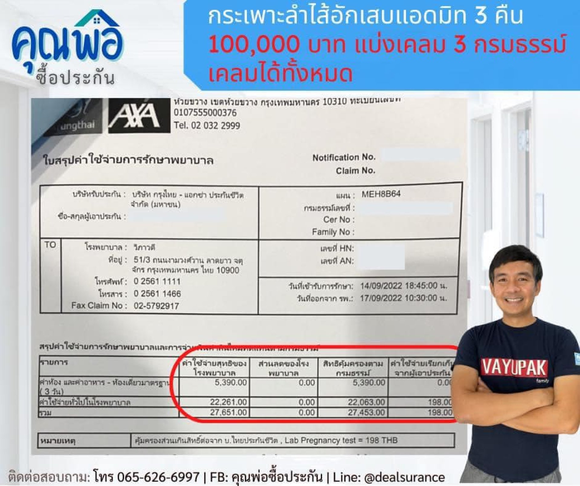ลูกค้าแอดมิดด้วยอาการ อาหารเป็นพิษ นอน รพ. 3 วัน ค่าใช้จ่ายรวม 1 แสนบาท เนื่องจาก ลูกค้ามีประกันสุขภาพ 3 เล่ม มากจาก