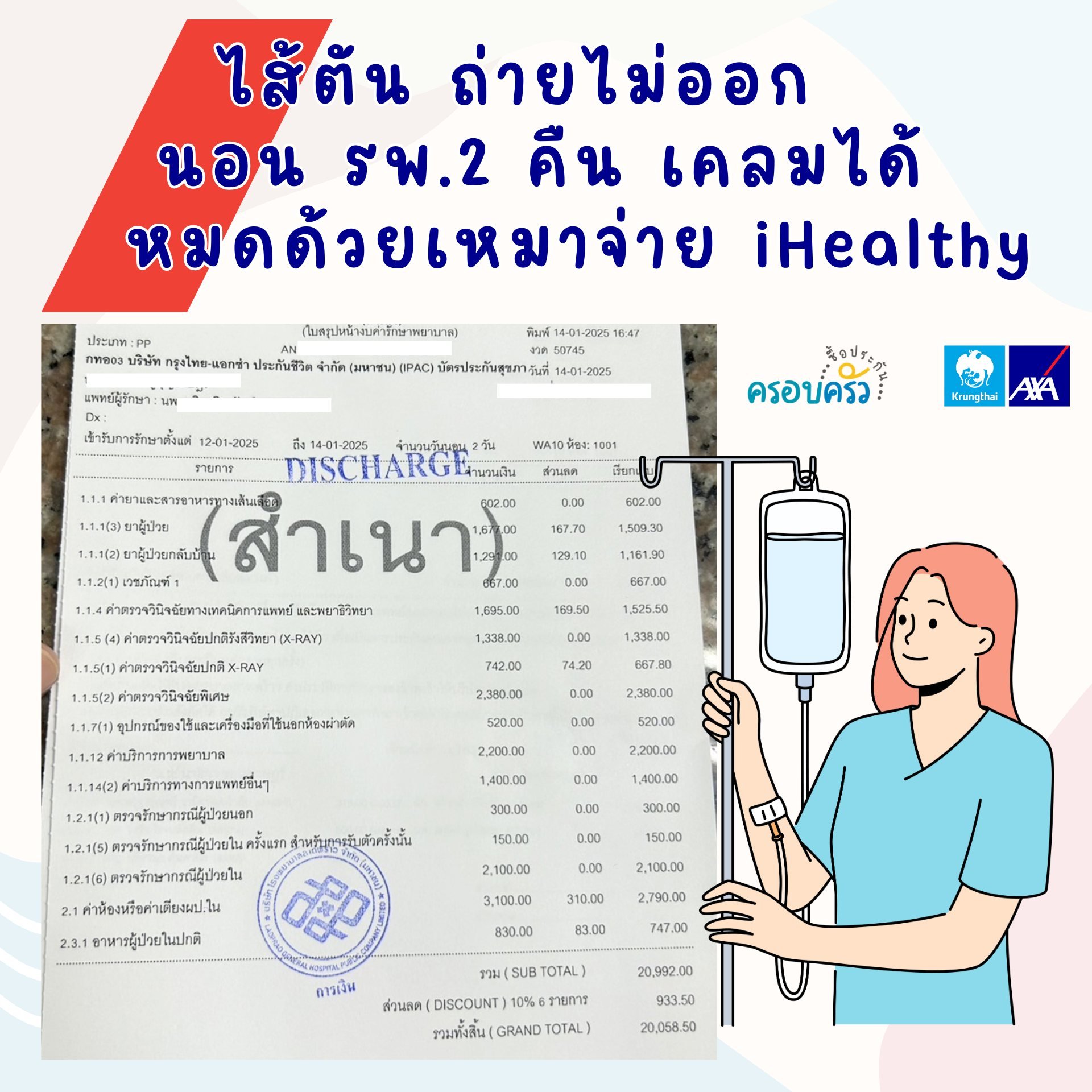 ถ่ายไม่ออก ลำไส้อุดตัน นอน รพ. 2 คืน เคลมได้ทั้งหมด ด้วยแบบ #ประกันสุขภาพเหมาจ่าย #iHealthyUltra จาก #กรุงไทยแอกซ่า
