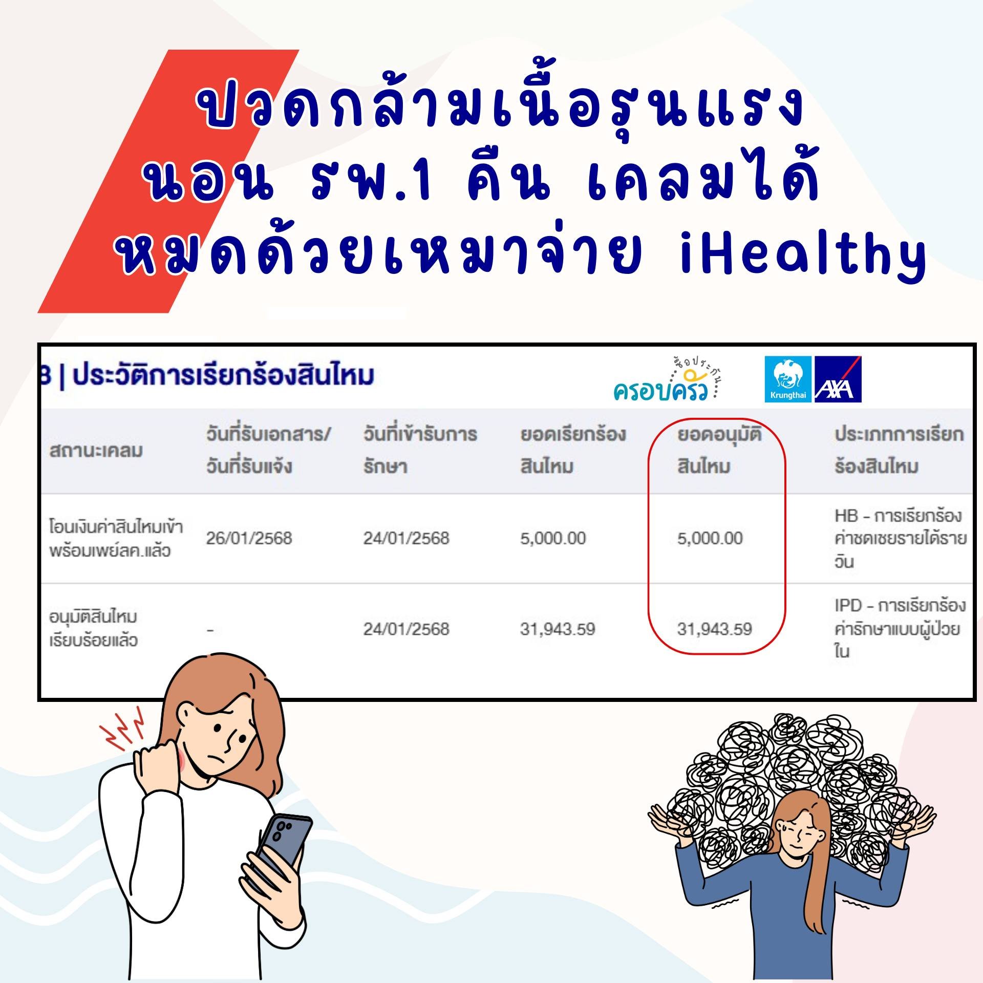 ปลาย มกราคม 2568 ลูกค้าแอดมิทด้วยอาการ #ปวดกล้ามเนื้อรุนแรง ซึ่งน่าจะเป็นอาการของ #ออฟฟิศซินโดรม อย่างหนัก ลูกค้าทำประกันสุขภาพเหมาจ่าย iHealthy