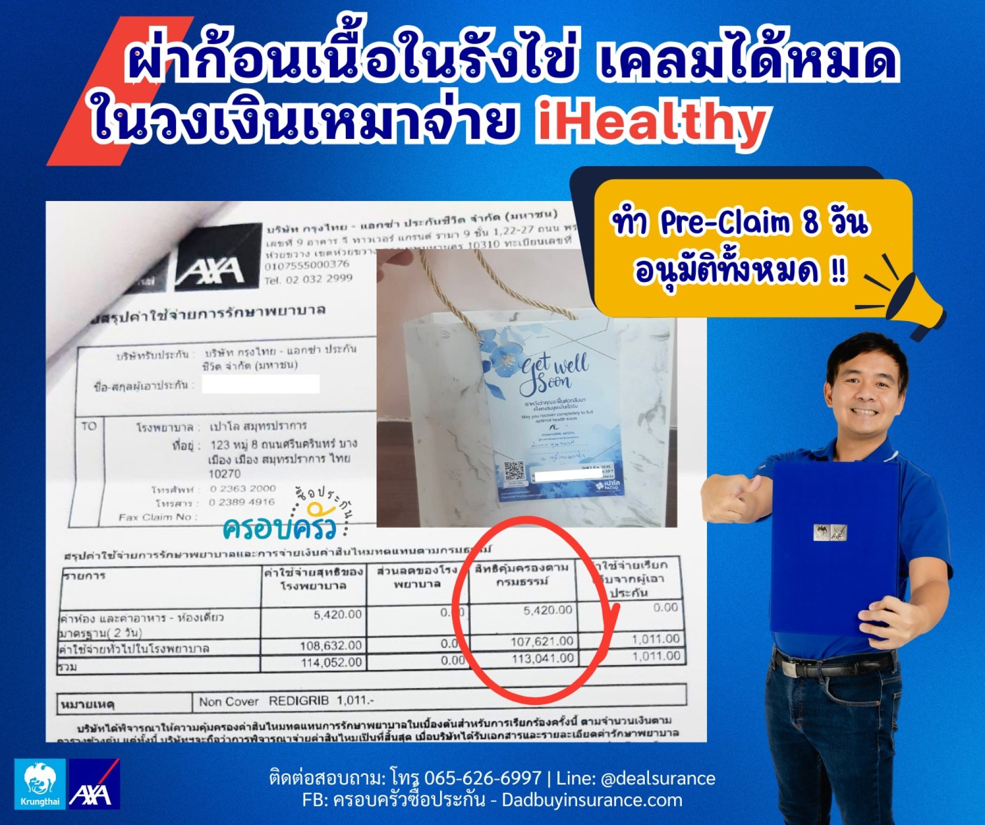 น้องเข้ารับการผ่าตัดเรียบร้อยนอนพัก รพ. 2 คืน รวมค่าใช้จ่าย 113,000 บาท เคลมได้ทั้งหมด ด้วยแบบประกันสุขภาพเหมาจ่าย iHealthy จาก กรุงไทยแอกซ่า